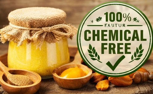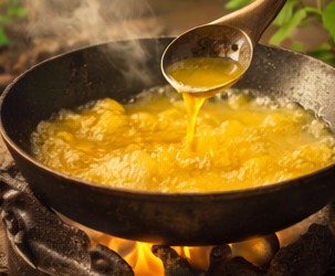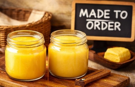 We start with fresh milk from our own cows and buffaloes. The milk is boiled and set into curd, then churned using the traditional bilona method to extract butter. This butter is slowly heated on a low flame until it turns into rich, golden ghee.